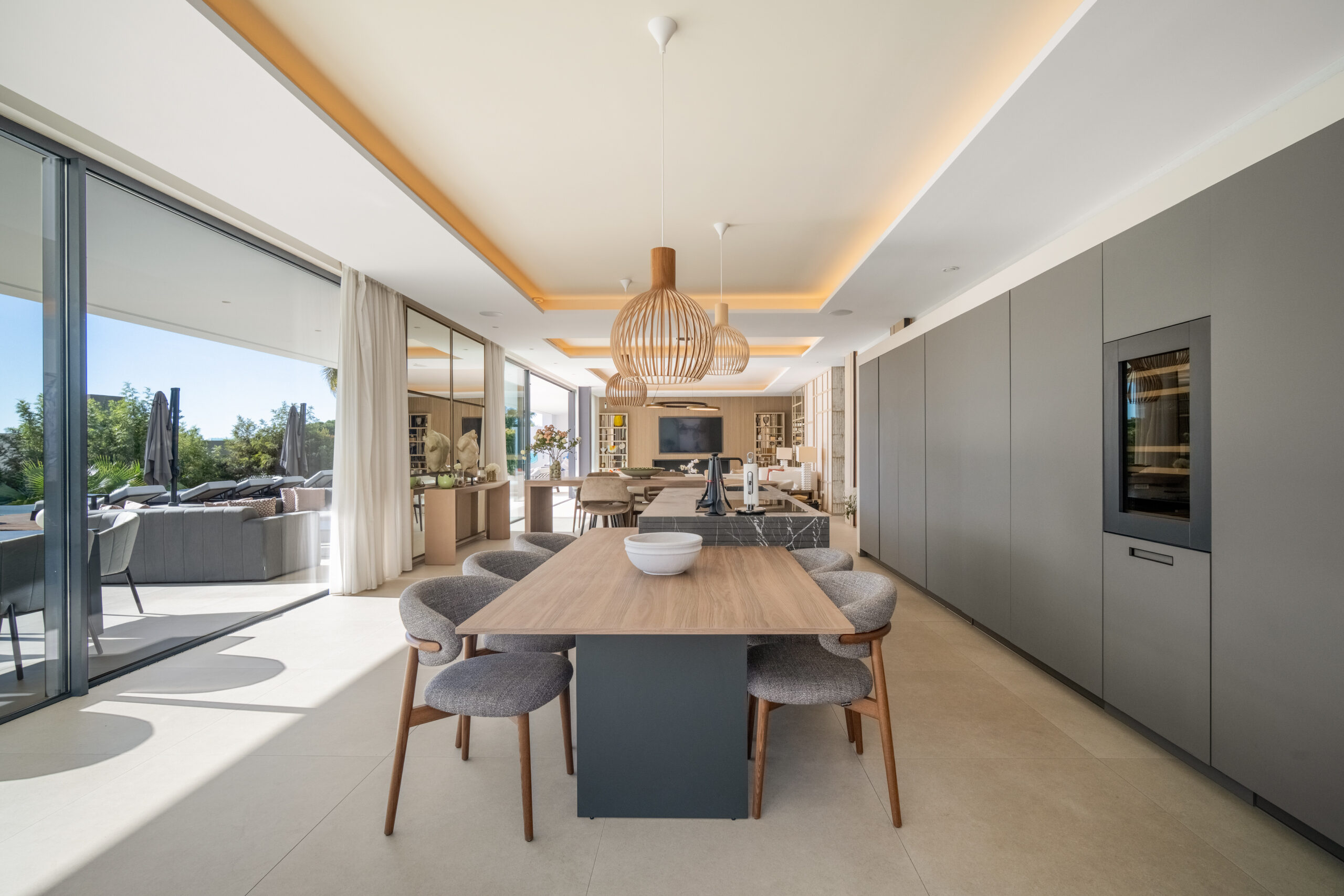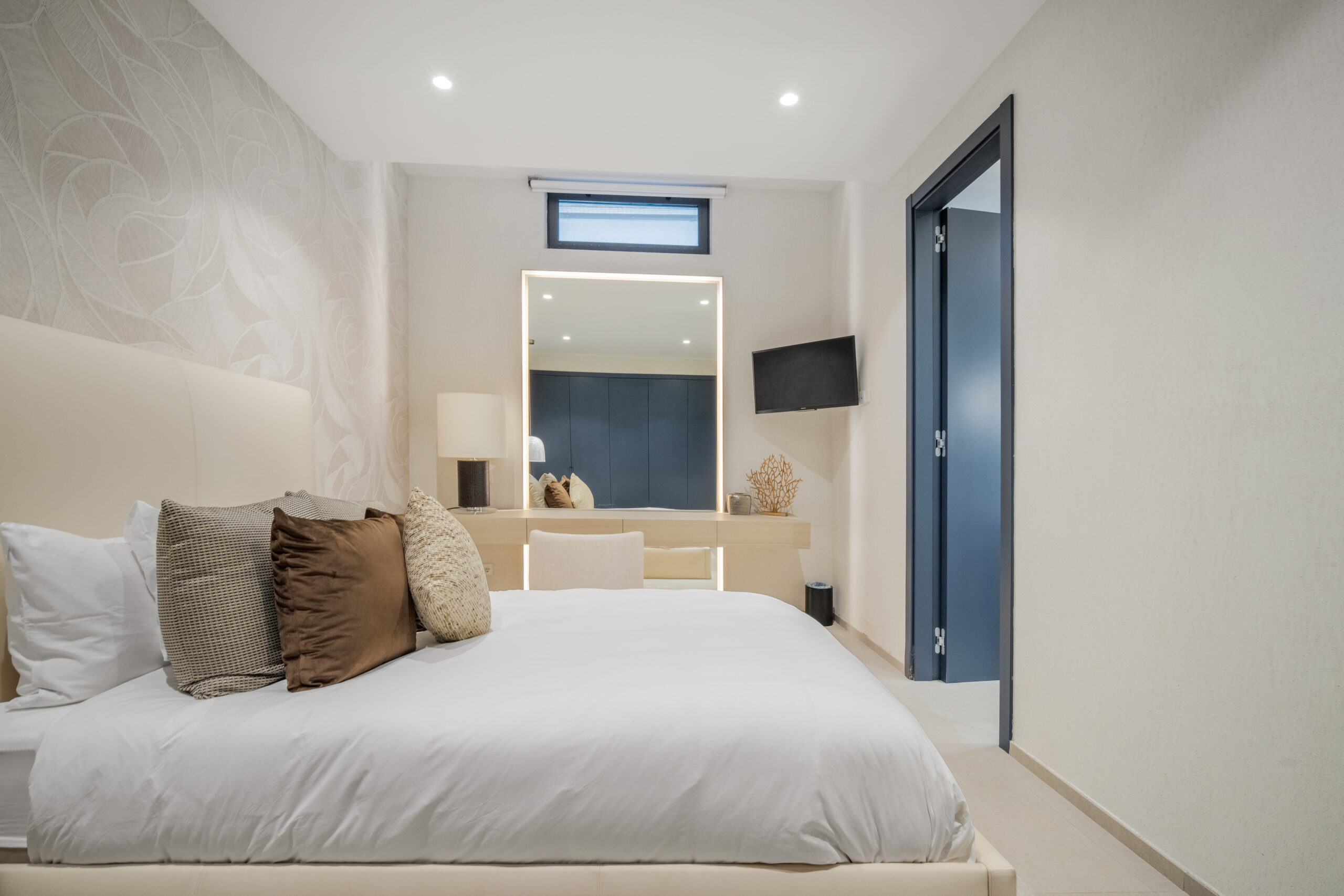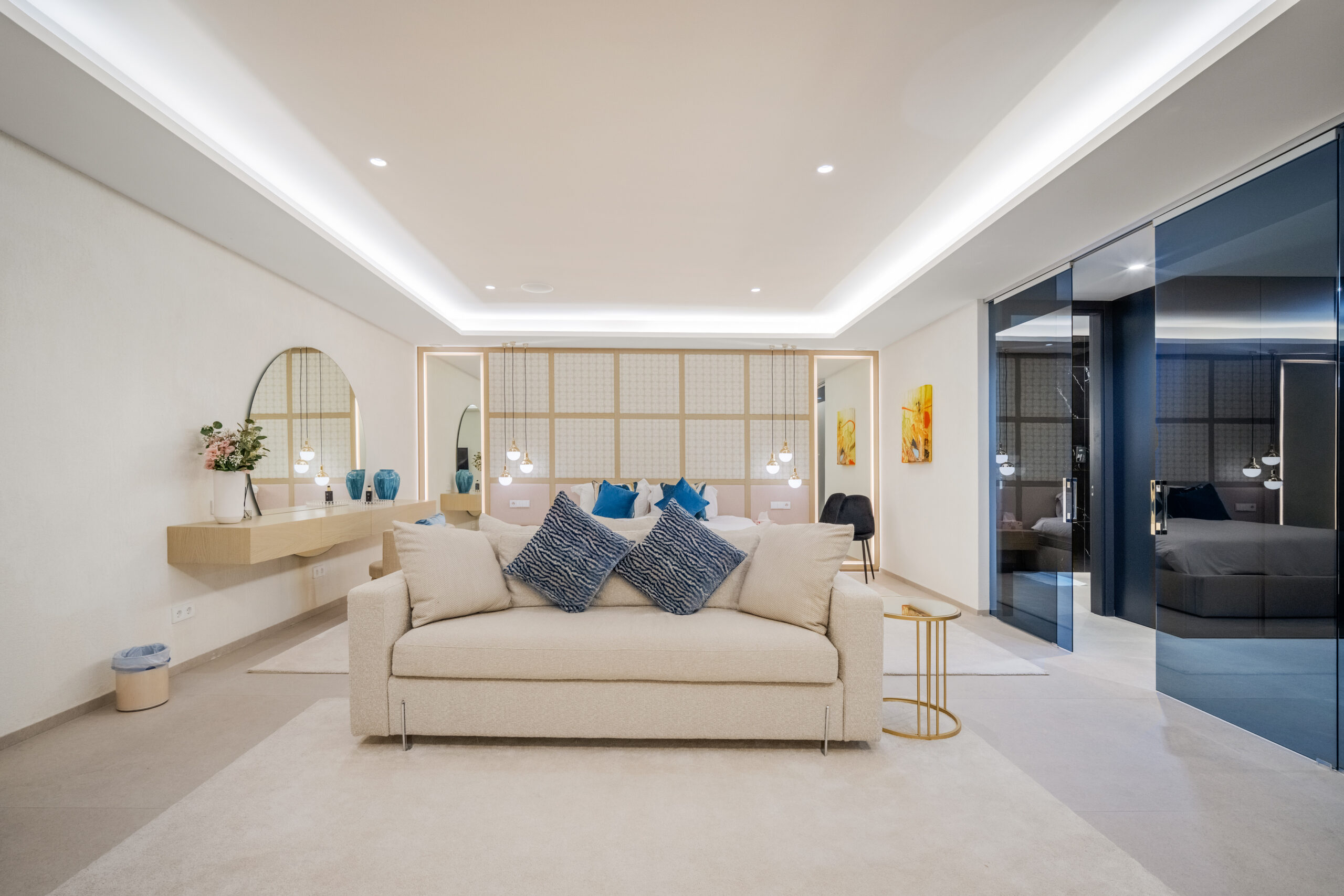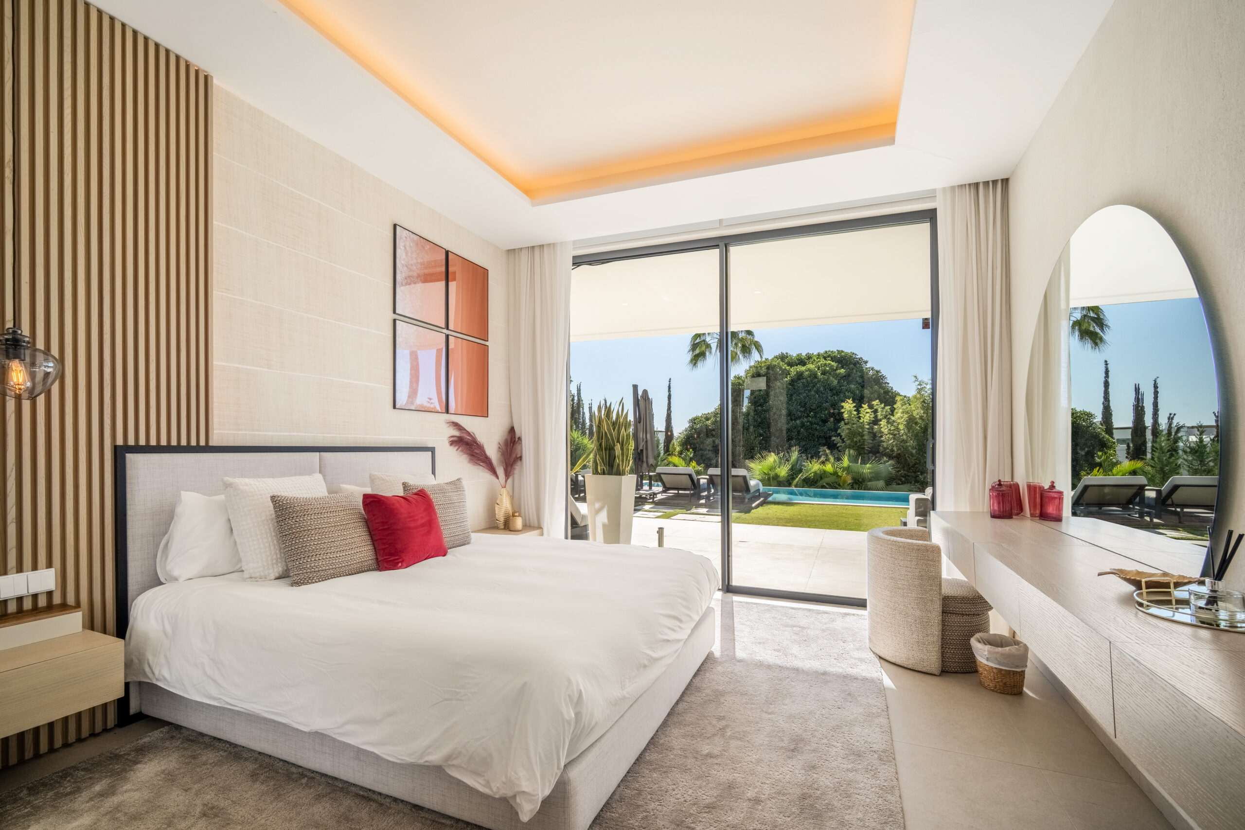 Passons aux choses sérieuses: la Villa Mirage a été bâtie sur un terrain généreux de 1900 mètres carrés, comprenant trois étages et des places de parking pouvant accueillir jusqu’à huit voitures (deux stationnements couverts et six dans la rue). Son élégant extérieur blanc dégage un charme moderne, tandis que les huit chambres à coucher avec salle de bains sont astucieusement réparties pour offrir un maximum d’espace et d’intimité, avec trois chambres à coucher au sous-sol, deux au rez-de-chaussée et deux à l’étage supérieur. Chaque chambre à coucher est spacieuse et décorée avec style. Le rez-de-chaussée dispose d’un salon accueillant aux tons clairs donnant sur le jardin et la piscine. Les terrasses sont tout aussi impressionnantes et la cuisine présente une finition élégante en gris ardoise.