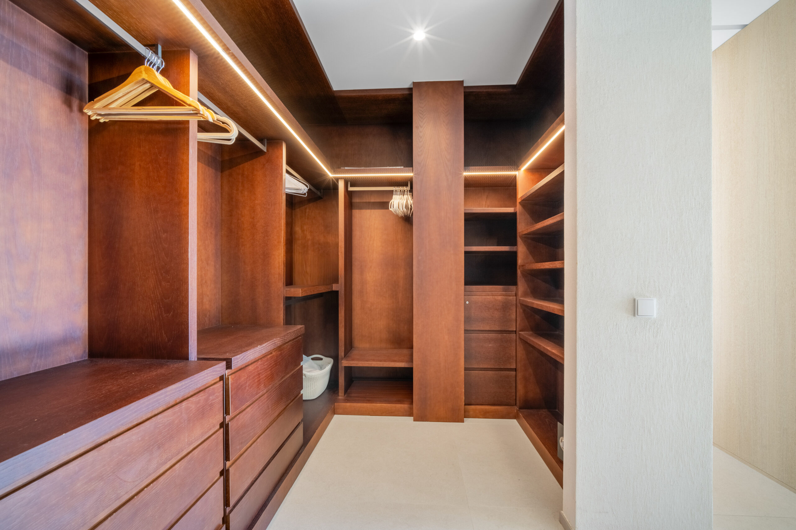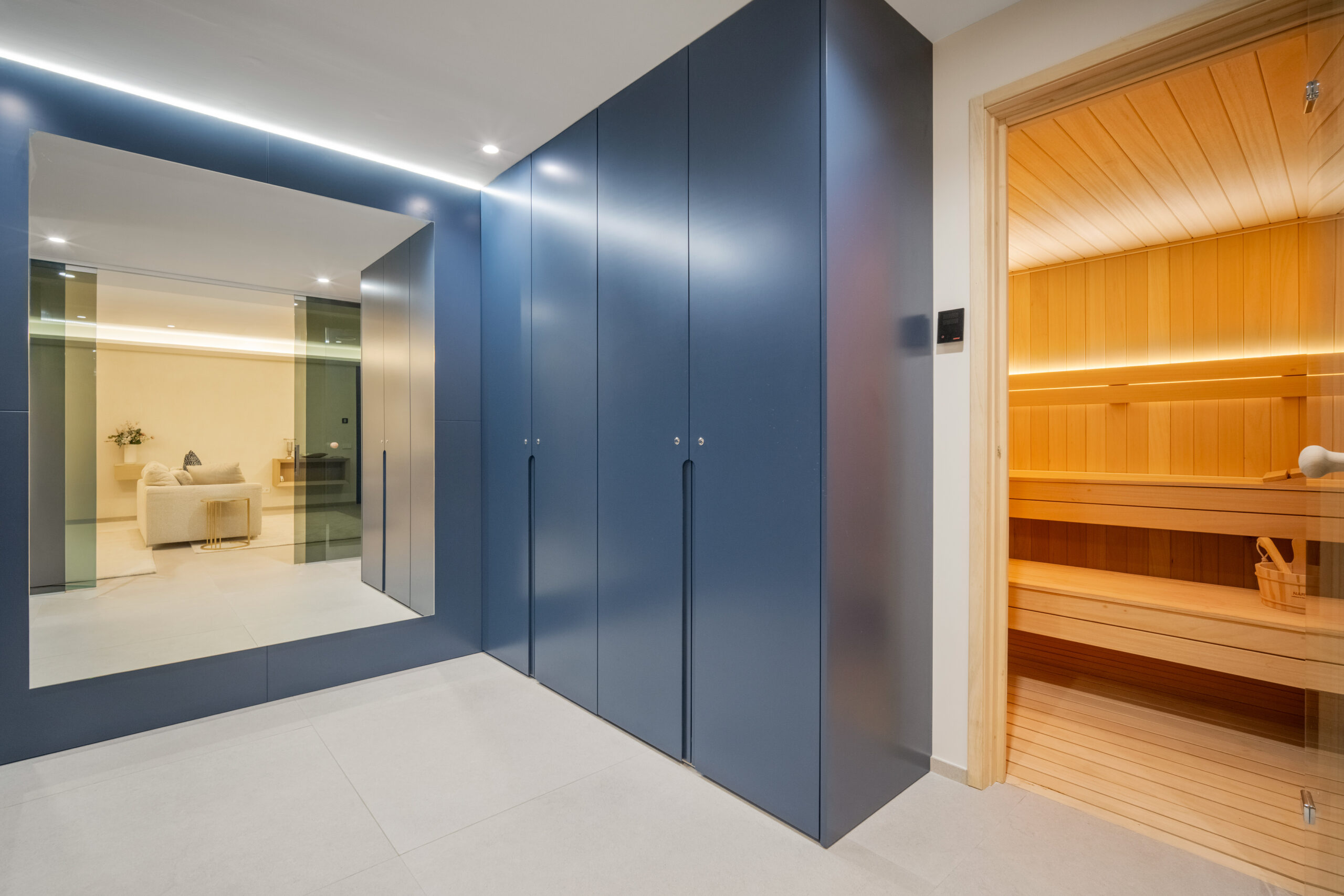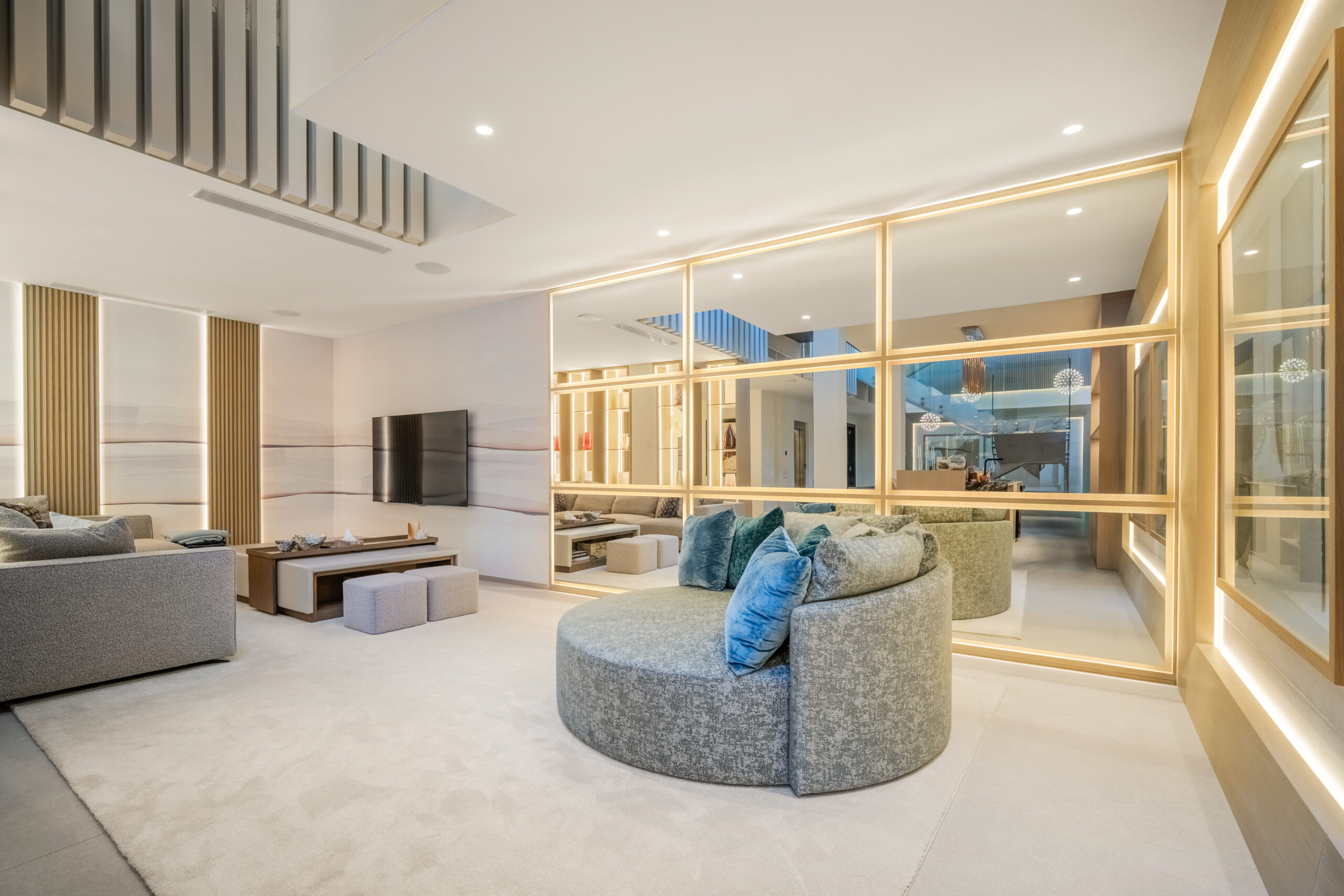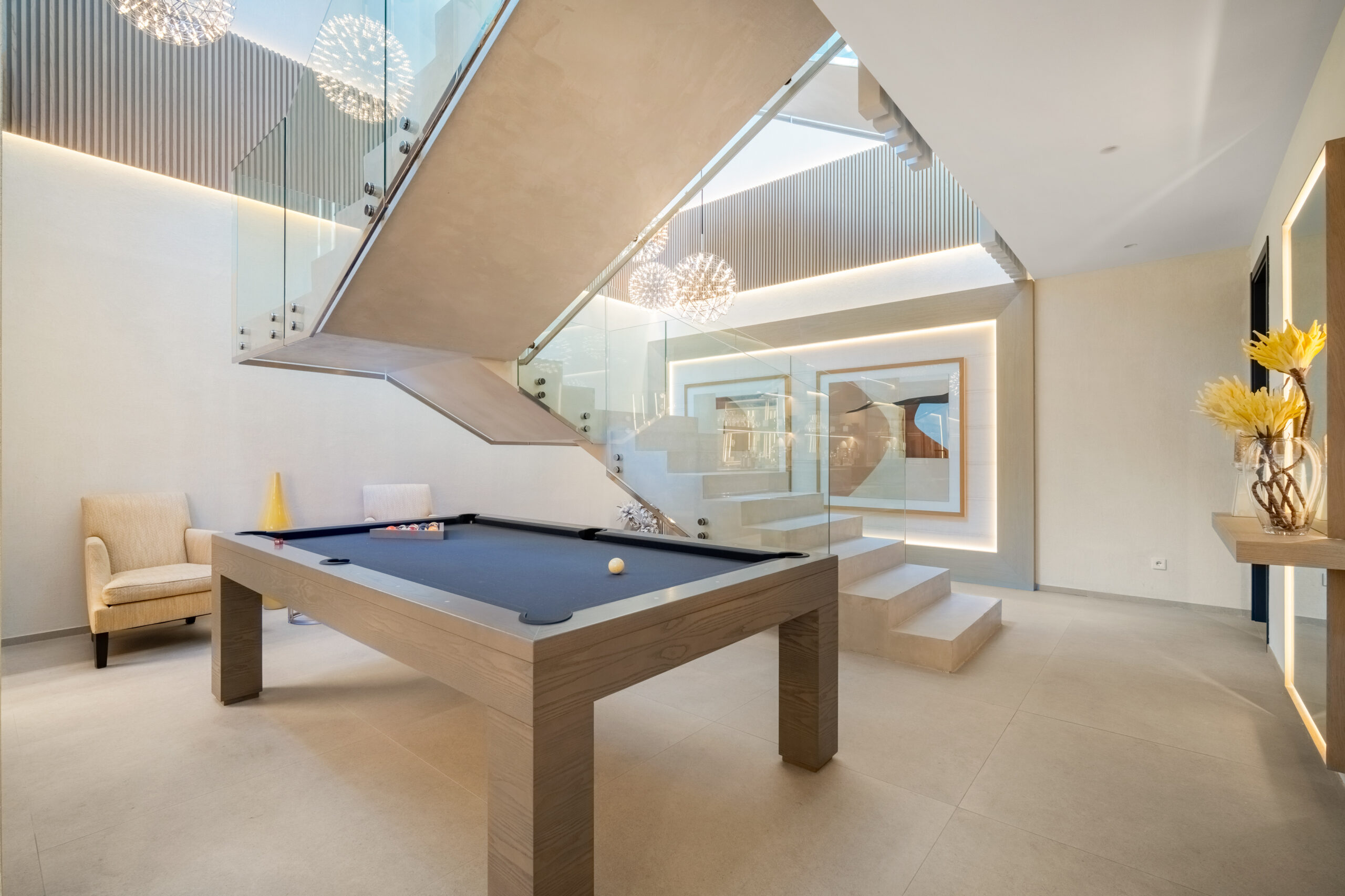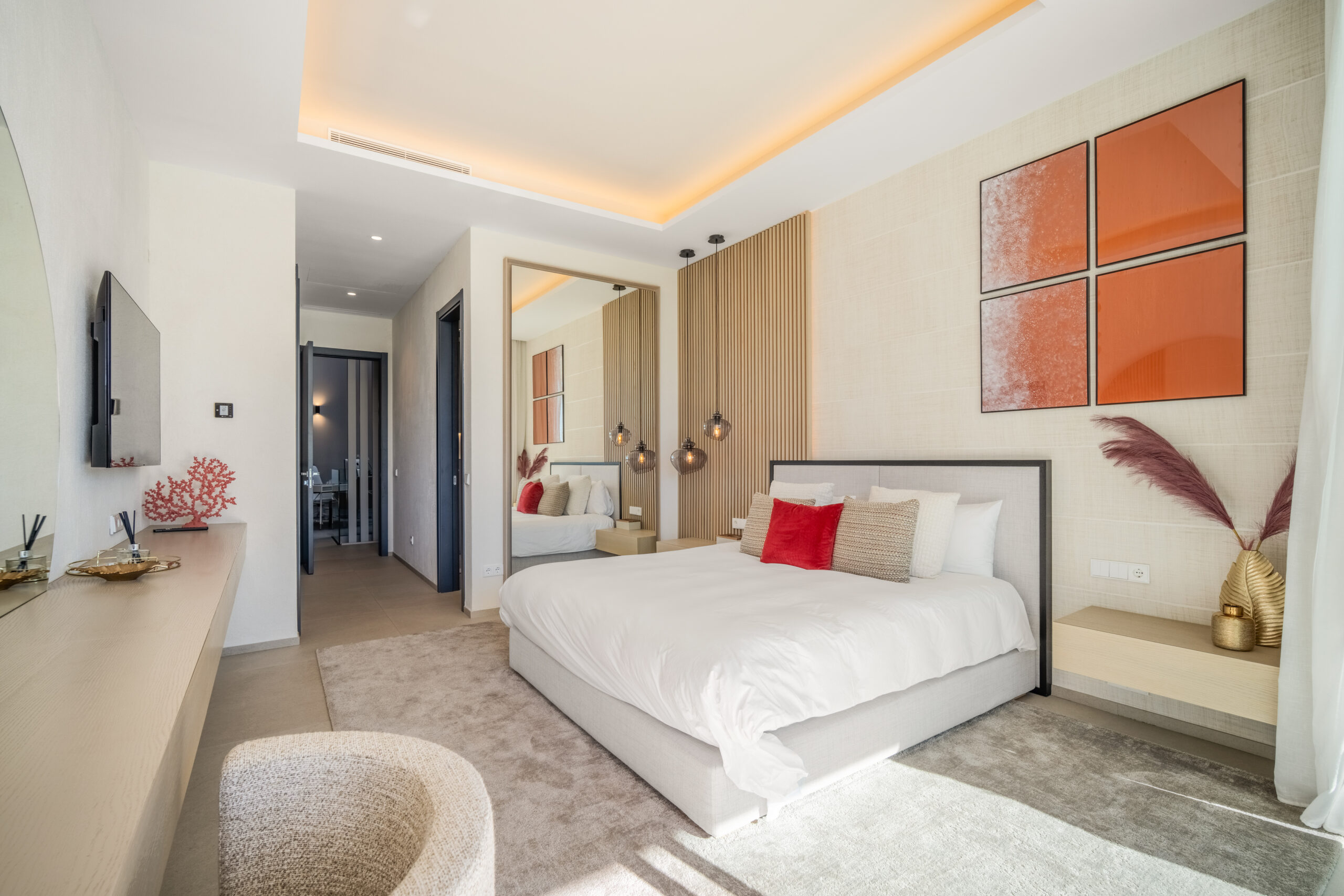 Passons aux choses sérieuses: la Villa Mirage a été bâtie sur un terrain généreux de 1900 mètres carrés, comprenant trois étages et des places de parking pouvant accueillir jusqu’à huit voitures (deux stationnements couverts et six dans la rue). Son élégant extérieur blanc dégage un charme moderne, tandis que les huit chambres à coucher avec salle de bains sont astucieusement réparties pour offrir un maximum d’espace et d’intimité, avec trois chambres à coucher au sous-sol, deux au rez-de-chaussée et deux à l’étage supérieur. Chaque chambre à coucher est spacieuse et décorée avec style. Le rez-de-chaussée dispose d’un salon accueillant aux tons clairs donnant sur le jardin et la piscine. Les terrasses sont tout aussi impressionnantes et la cuisine présente une finition élégante en gris ardoise.