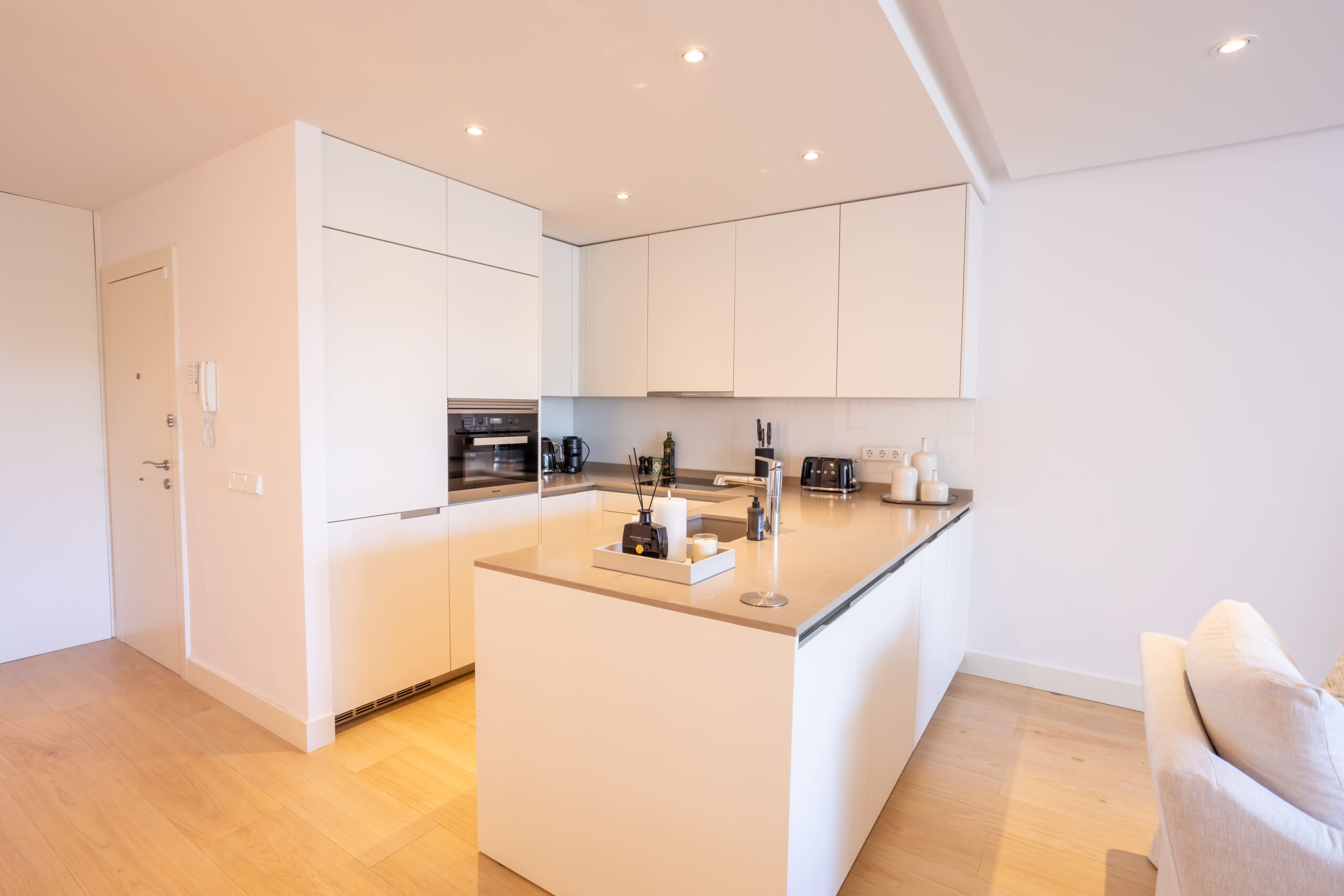The living and dining area opens directly onto a charming south-facing terrace, where tranquil garden views create the perfect backdrop for morning coffee or evening relaxation. The fully equipped kitchen, with premium appliances and sleek cabinetry, ensures both practicality and style.