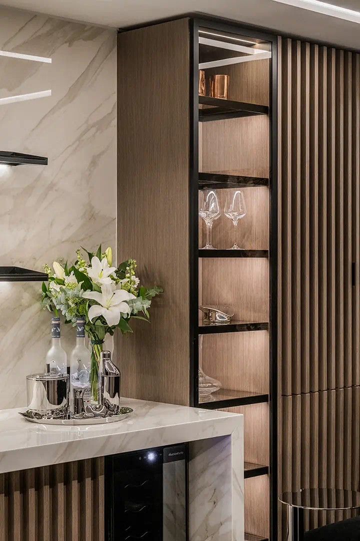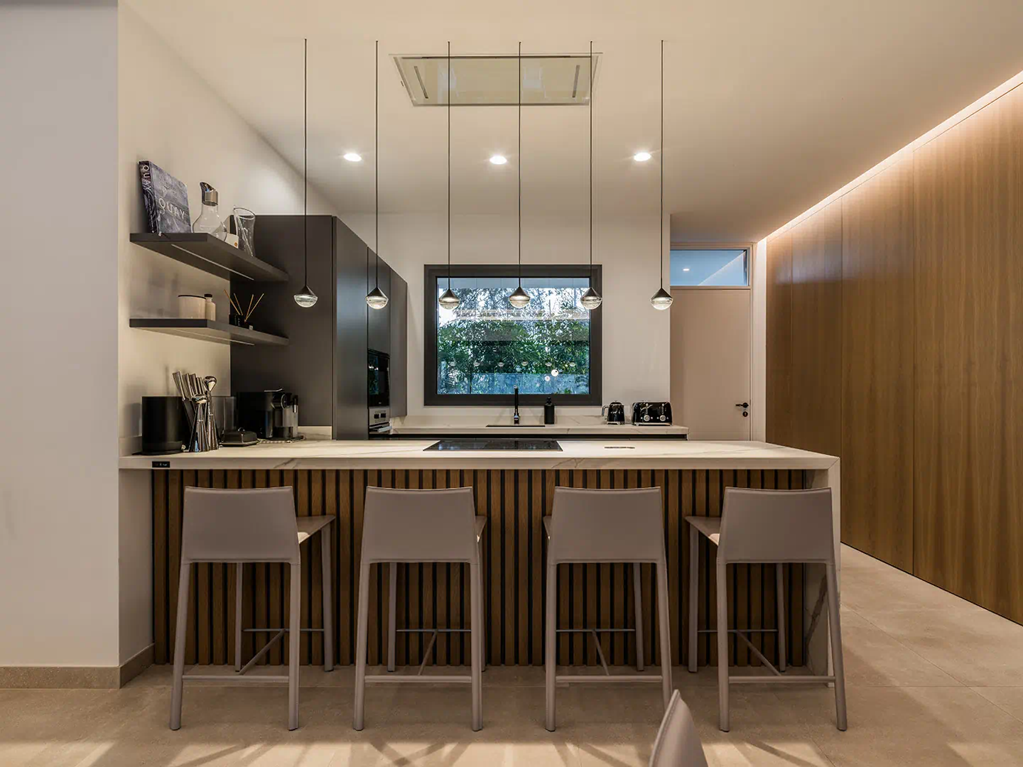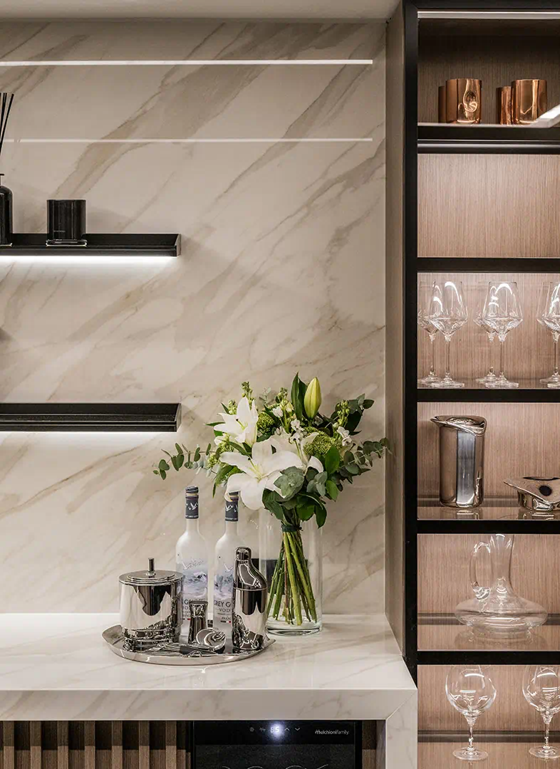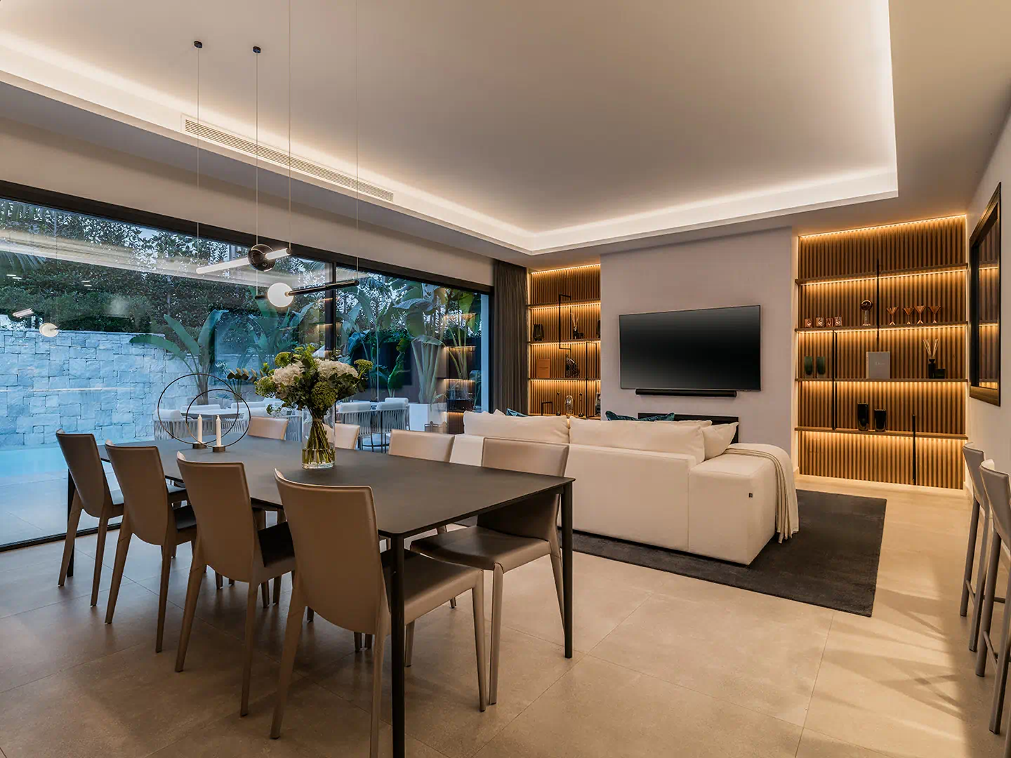Inside, you’ll find four stylish bedrooms, three bathrooms and a downstairs cloakroom, all featuring high-quality finishes and thoughtful details that evoke understated sophistication. The main living area showcases an open-plan design that connects the kitchen, dining, and lounge spaces, creating a fluid environment for socialising and relaxing. The Arredo3 kitchen, equipped with Miele appliances, sits at the heart of the home, framed by Italian stone flooring and floor-to-ceiling glass doors that open directly onto the terraces and garden, allowing natural light to flood the interiors.