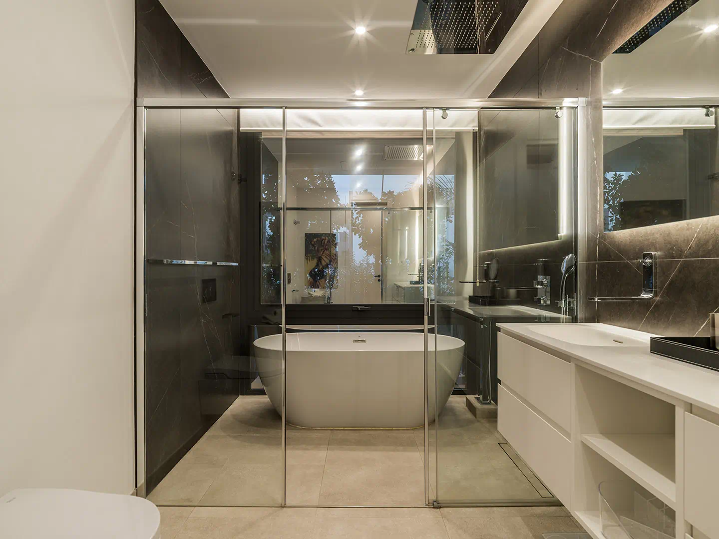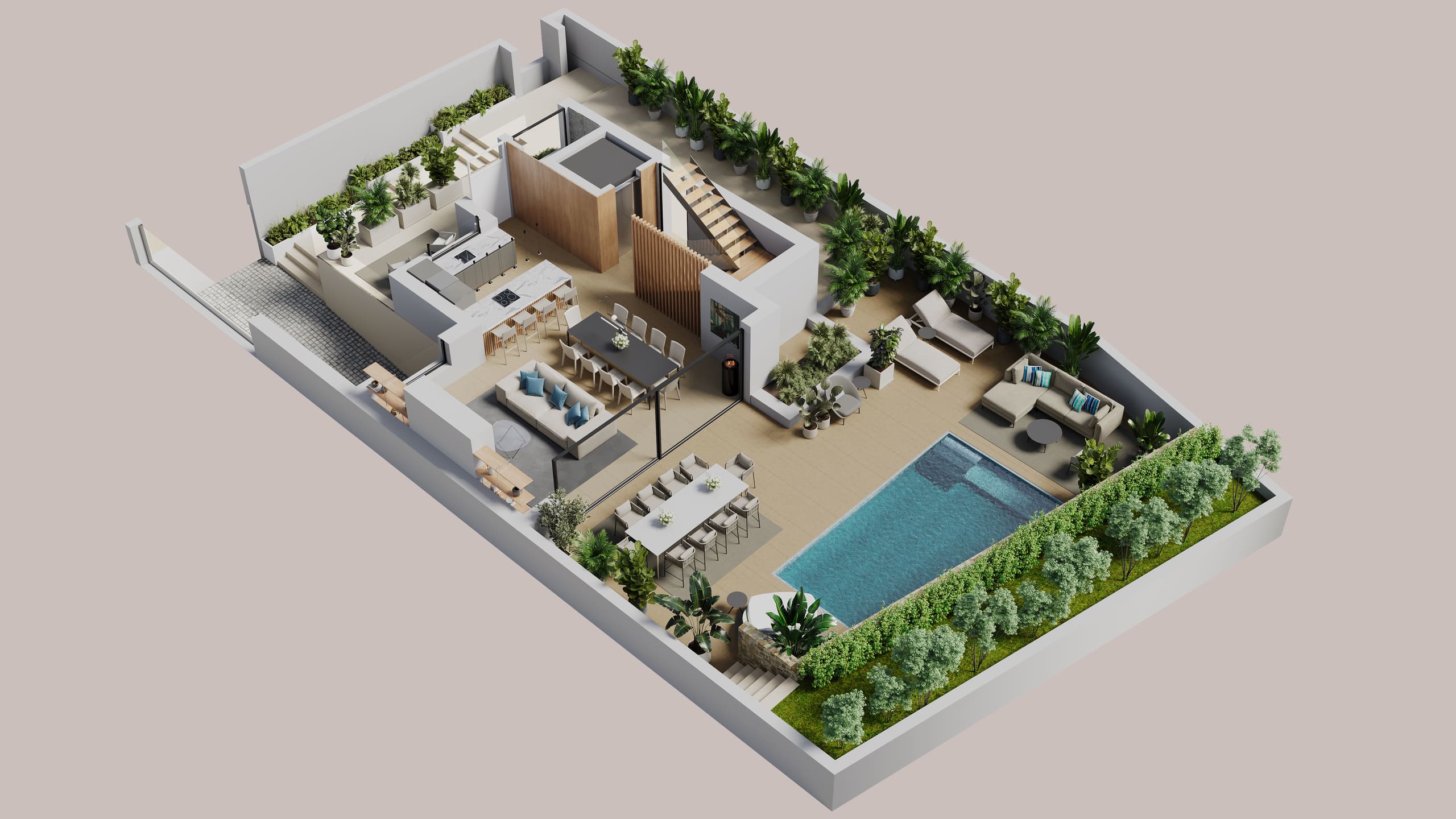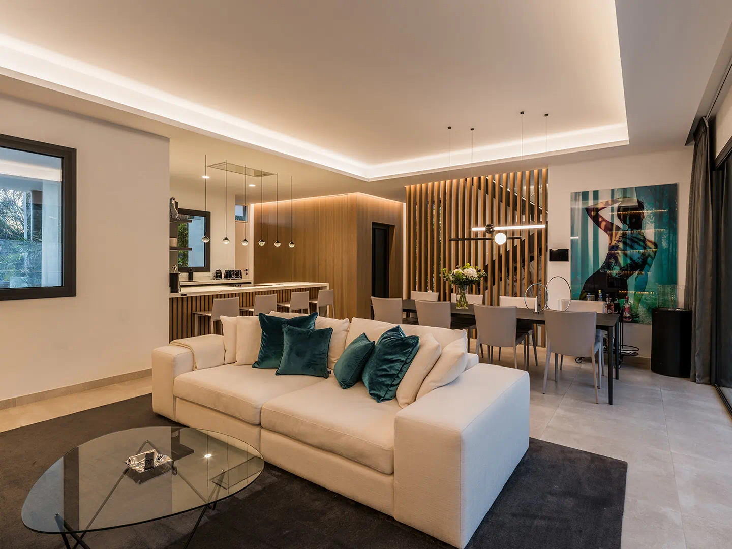 Inside, you’ll find four stylish bedrooms, three bathrooms and a downstairs cloakroom, all featuring high-quality finishes and thoughtful details that evoke understated sophistication. The main living area showcases an open-plan design that connects the kitchen, dining, and lounge spaces, creating a fluid environment for socialising and relaxing. The Arredo3 kitchen, equipped with Miele appliances, sits at the heart of the home, framed by Italian stone flooring and floor-to-ceiling glass doors that open directly onto the terraces and garden, allowing natural light to flood the interiors.