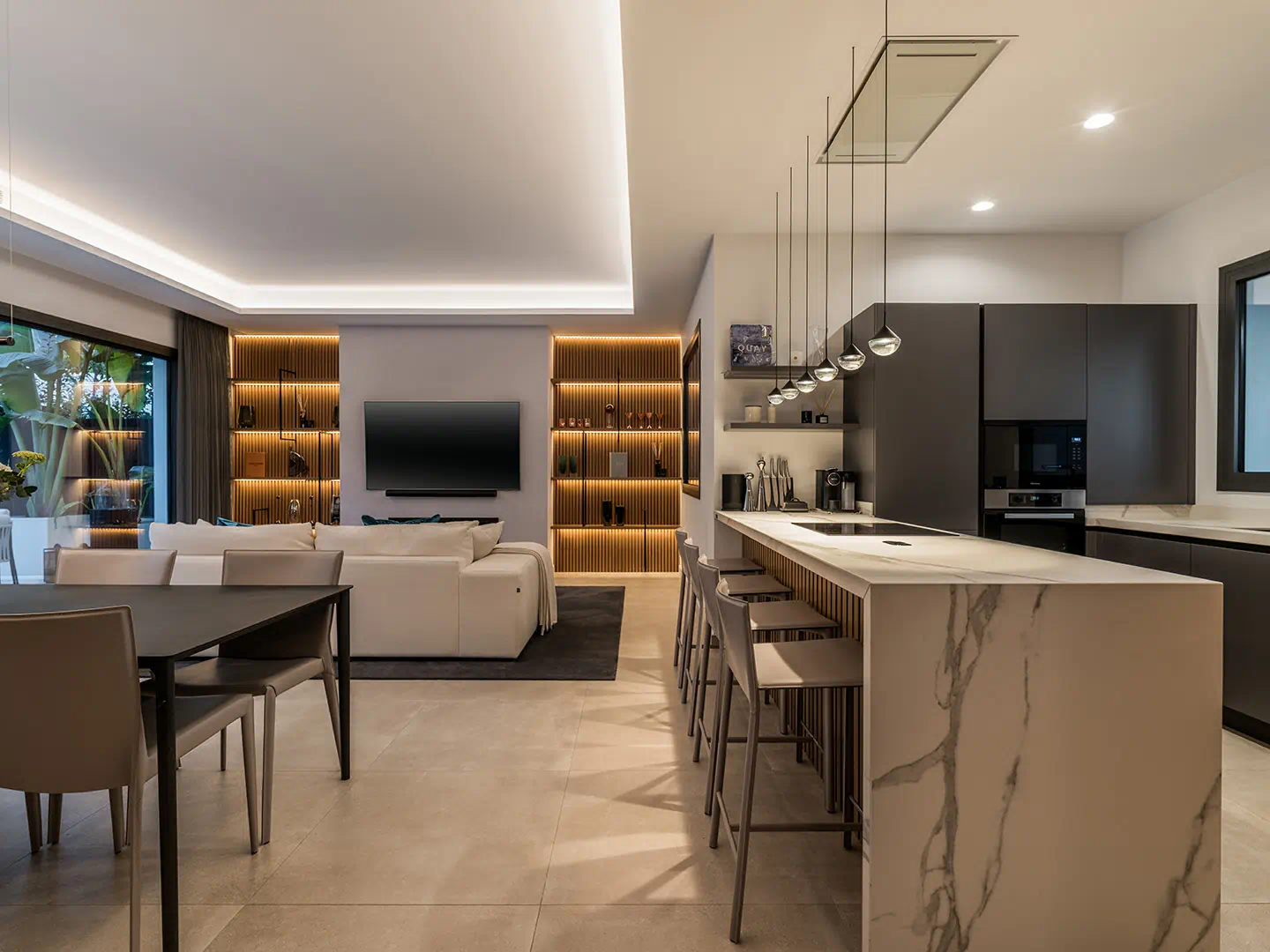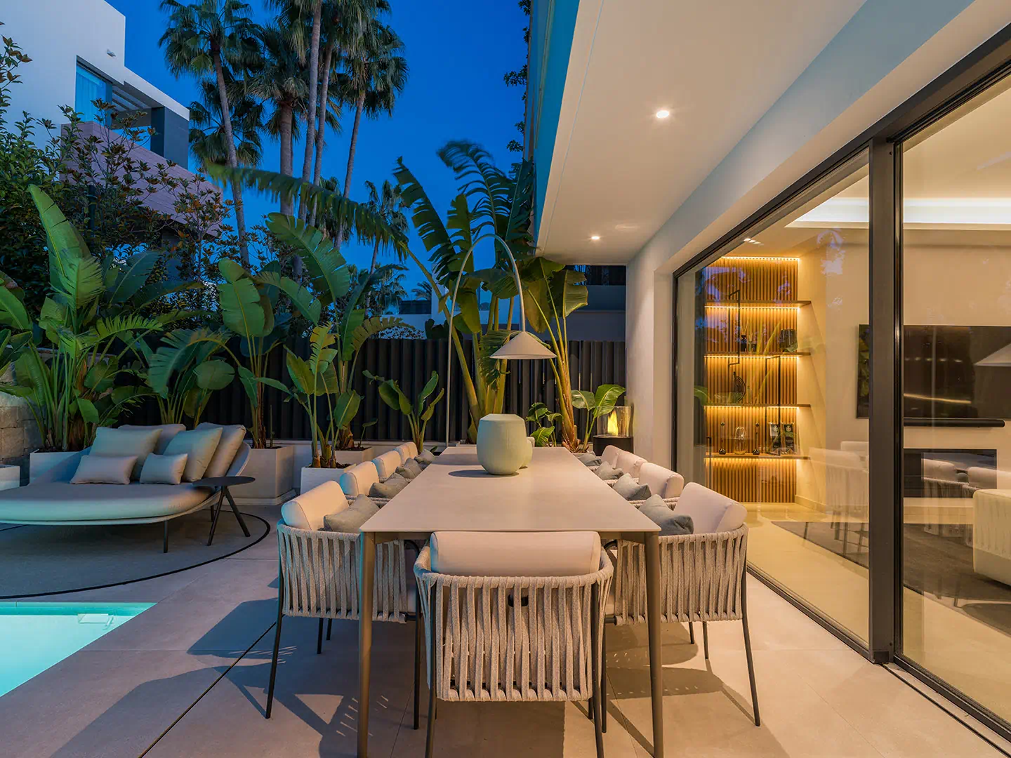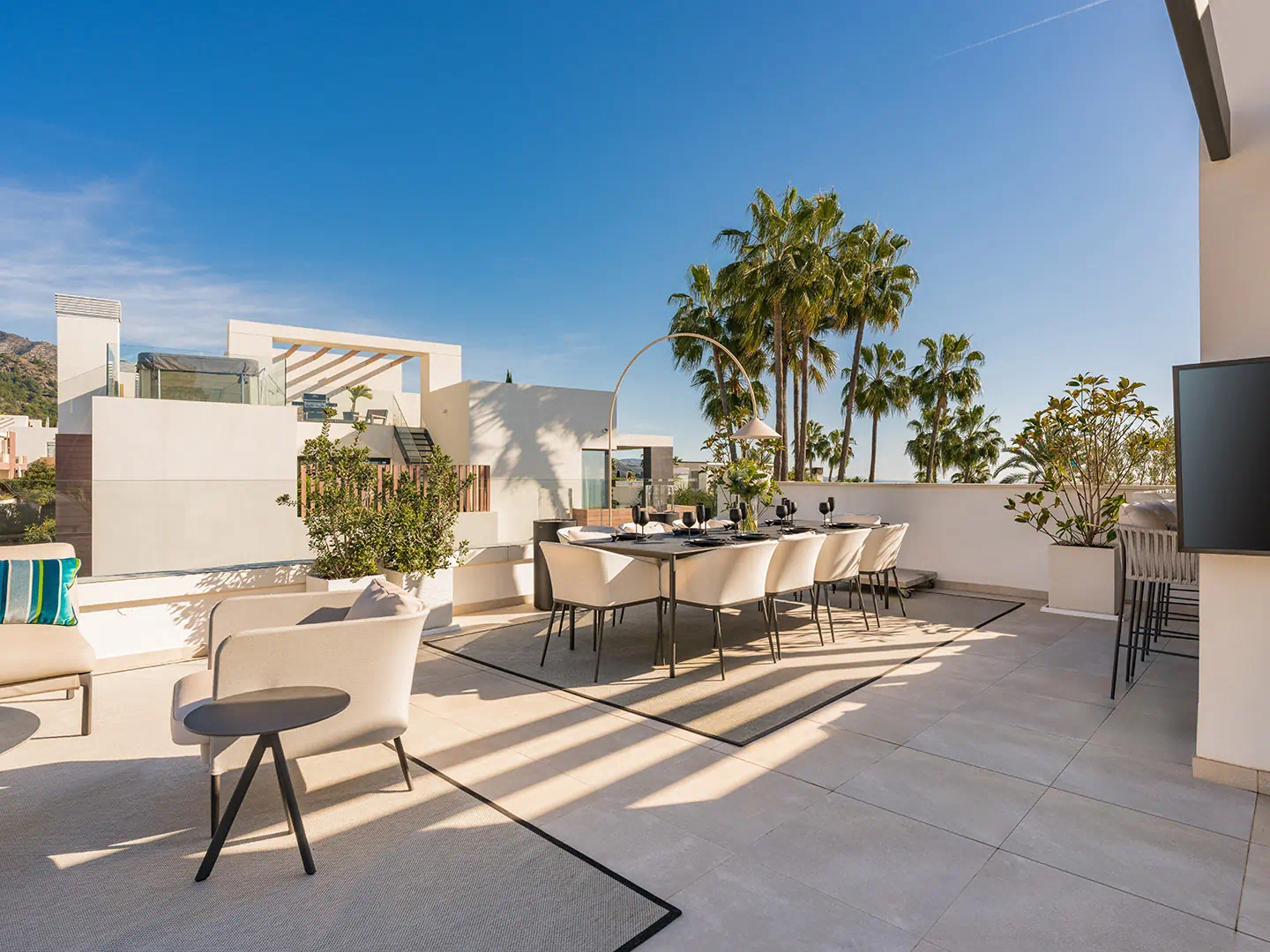 Above it all sits the rooftop terrace, a spectacular space that elevates the villa to another level of indulgence. From here, you can admire panoramic views of the Mediterranean Sea, the African coastline, and the majestic La Concha Mountain. With its jacuzzi, outdoor lounge, dining area, and bar – this rooftop oasis offers the perfect setting for sunset cocktails and starlit gatherings.