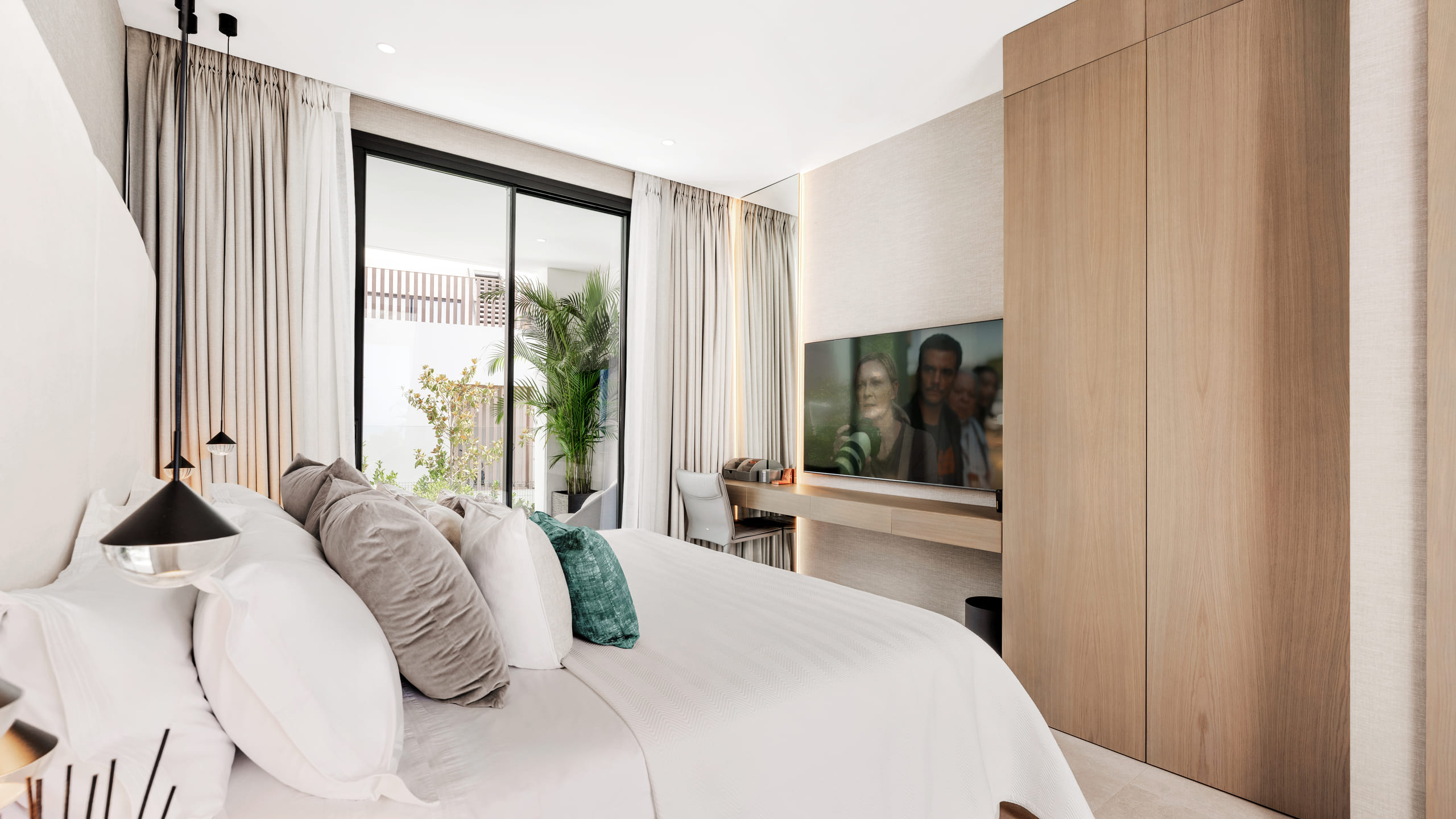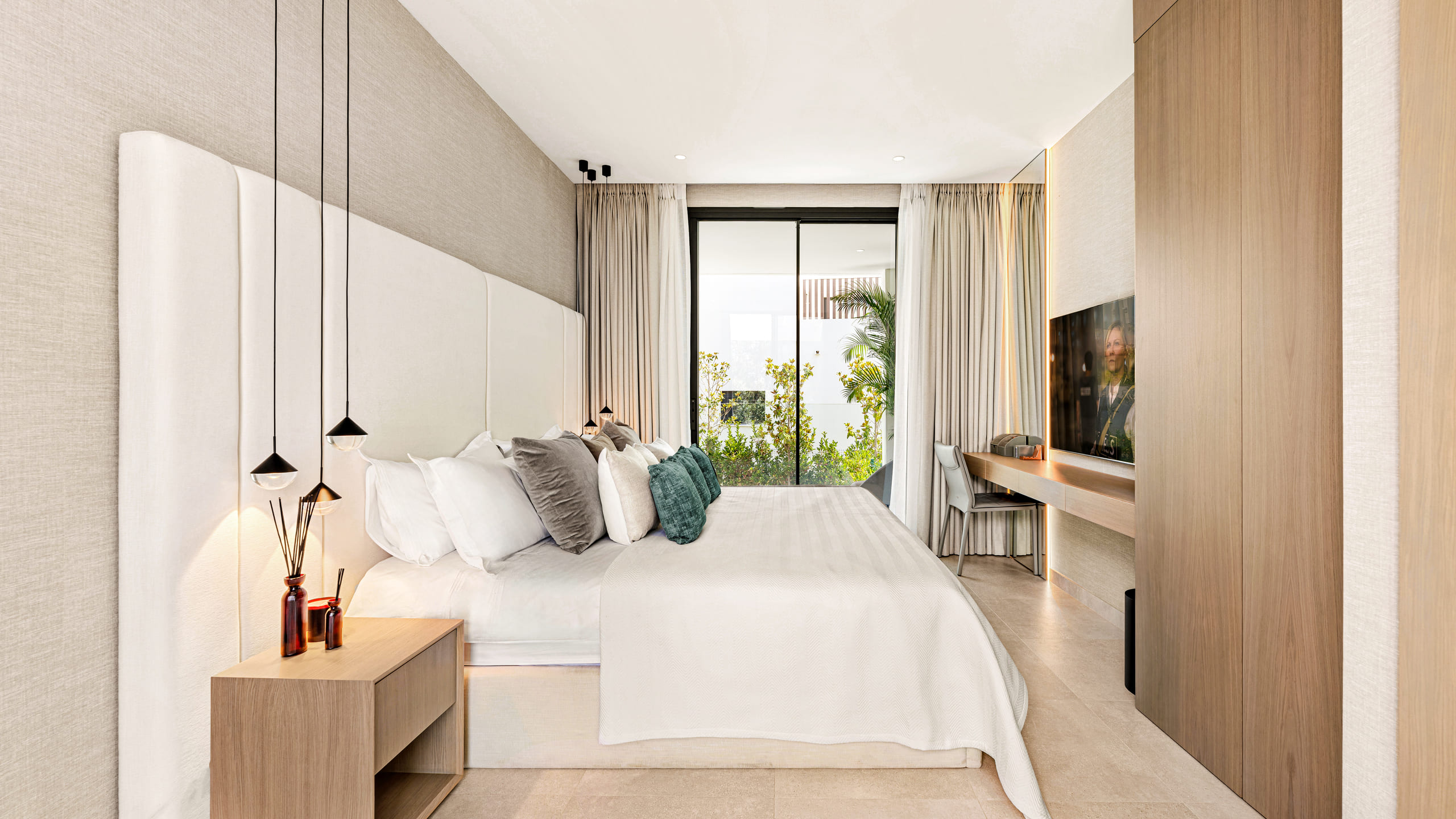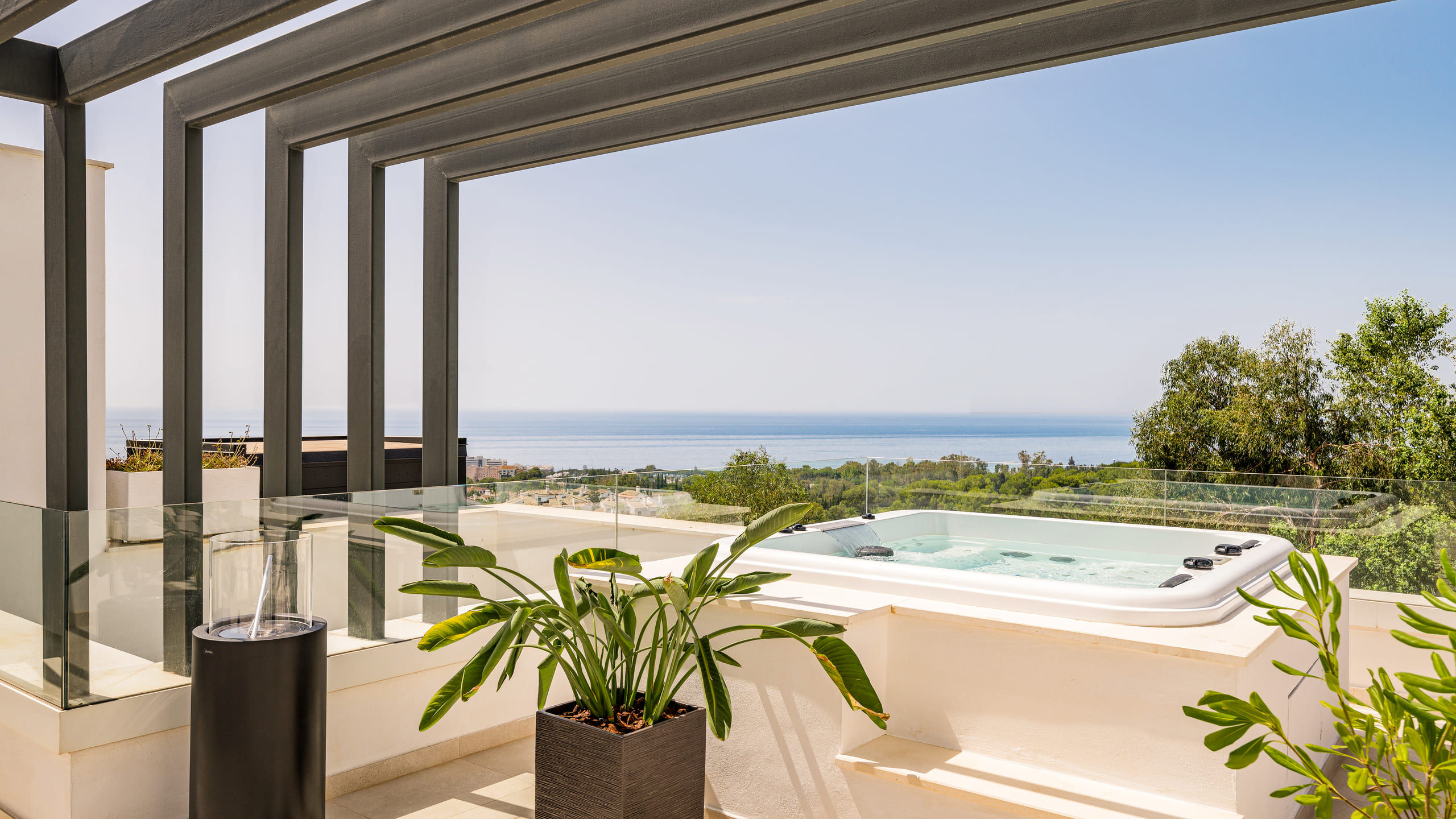 Above it all sits the rooftop terrace, a spectacular space that elevates the villa to another level of indulgence. From here, you can admire panoramic views of the Mediterranean Sea, the African coastline, and the majestic La Concha mountain. The rooftop has been conceived as a private spa retreat, featuring a jacuzzi for eight and a beautifully designed sauna — ideal for moments of relaxation and rejuvenation. With its outdoor lounge, dining area, and bar, this rooftop oasis offers the perfect setting for sunset cocktails, wellness sessions, or starlit gatherings. The villa also features underfloor heating, air conditioning, and an elevator connecting all floors, ensuring that comfort and convenience are never compromised.