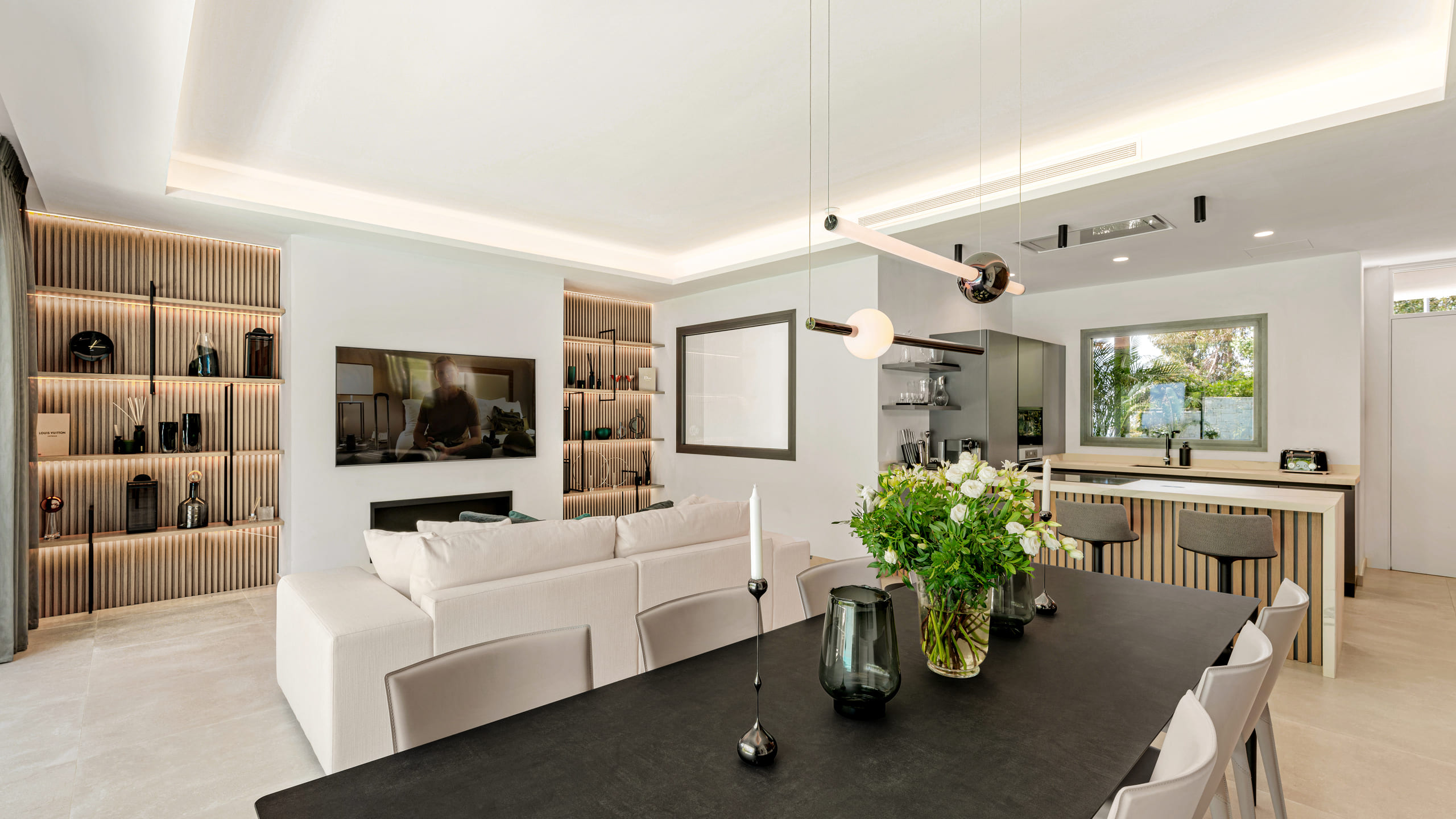 Perfectly positioned in one of Marbella’s most prestigious gated communities, this stunning property blends modern architecture, refined interiors, and sweeping Mediterranean views, offering an idyllic setting for a luxurious getaway on the Costa del Sol. Beyond its elegant living areas, the villa also boasts a fully equipped basement level complete with a private gym and a dedicated home salon — perfect for those seeking wellness, beauty, and relaxation without leaving the comfort of home. Designed with elegance and comfort in mind, the villa offers approximately 278 m² of bright, open living space distributed across multiple levels. Inside, you’ll find four stylish bedrooms and three bathrooms, all featuring high-quality finishes and thoughtful details that evoke understated sophistication. The main living area showcases an open-plan design that connects the kitchen, dining, and lounge spaces, creating a fluid environment for socialising and relaxing. The Porcelanosa kitchen, equipped with premium appliances, sits at the heart of the home, framed by Italian marble flooring and floor-to-ceiling glass doors that open directly onto the terraces and garden, allowing natural light to flood the interiors.