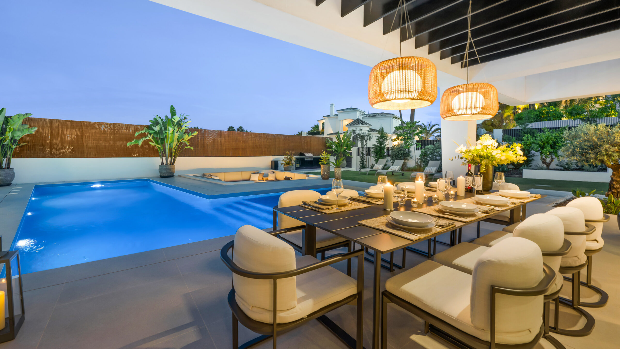 - Seamless indoor-outdoor living with pool, gardens, and outdoor kitchen